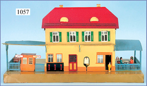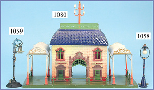 BING Bahnhof, seitlich mit Gehsteigüberdachungen, Mitteldurchgang, 38 x 16 cm, Blech handlackiert, Fenster lithogr., bis auf kl. altersbedingte Lackfehler am Boden sehr schöner Orig.-Zust.
