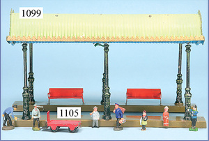 MÄRKLIN 2060/38 (2630), seltene Bahnsteig-Überdachung, 26 cm lang, 21 cm breit, 22,5 cm hoch, Bänke neu verlötet, Einschnittstelle an einem Sockel, 1 Verzierung am Dach, nachgelötet, Farben gut