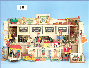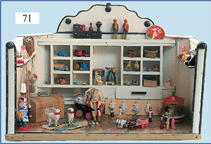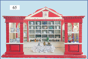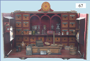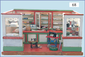 Kaufladen, wohl Eigenbau, überstrichen, Länge 56 cm, Tiefe 33 cm, Höhe 28 cm, mit reichh. Zubehör, Einrichtung für einen Spielzeugladen, Teile alt u. neu