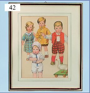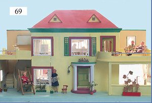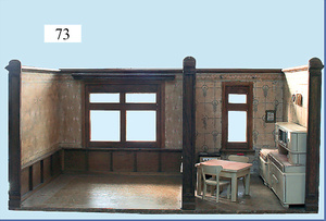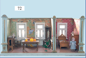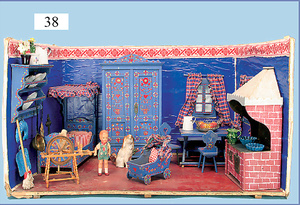2-teilige Puppenstube, wohl um 1900, Tapete an einigen Stellen ausgerissen, 2 Zimmer mit Durchgang, Länge 68 cm, Tiefe 34 cm, Höhe 30 cm, mit Holzmobiliar, Schlafzimmer u. Wohnzimmer