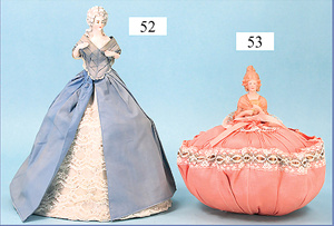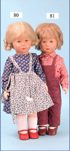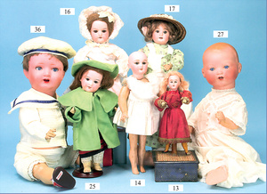 Porzellankopf-Puppe, gemarkt PS 23, blaue Schlafaugen, off. Mund, Zähne, Echthaarperücke fest aufgeklebt, bitte Transportrisiko für Augenmechanismus beachten, Kleberreste an der Kopfkrone u. Farbabrieb, kl. Brandfehler am Hinterkopf, auf Masse-Gliederkörper, bespielt, 52 cm, alte Kleidung u. Schuhe
