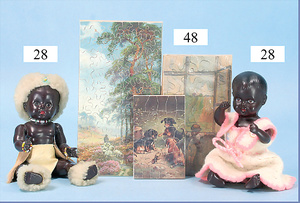 AM 341 Germany, Porzellan-Vollkopf, Negerbaby, braune festeingesetzte Glasaugen, etwas Farbabrieb am Hinterkopf, Masse-Sitzbaby, Körper Pappmaché, 30 cm