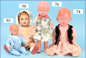 SCHILDKRÖT Einbindekopf-Puppe, gemarkt 49, blaue Schlafaugen, off. Mund, Zähne, modellierte Haare, Stoffkörper mit Stimme, Celluloidhände, 48 cm, dazu schönes altes Puppen-Gitterbett, Metall, Länge 65 cm
