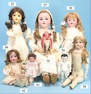 Porzellankopf-Puppe, gemarkt Germany B 4, blaue Schlafaugen, off. Mund, Echthaar-Perücke fest aufgeklebt, Transportrisiko für Augenmechanismus beachten, auf Masse-Gliederkörper, Hände ergänzt, Beine wohl 1x überstrichen, 56 cm, Brandlinien unter dem li. Auge