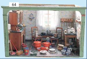 Küchengehäuse, Holz, ca. 20er Jahre, Länge 87 cm, Tiefe 64 cm, Höhe 55 cm, mit reichh. Zubehör, Küchenschrank, Bank, 2 Stühle u. Tisch, einige Teile Porzellan, Keramik, Besteck, Geschirr, orange/weiß emailliert u. v. m., bitte besichtigen