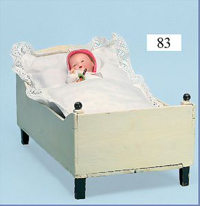 AM Porzellan-Vollkopf-Baby, gemarkt 351/4, blaue Schlafaugen, off. Mund, 2 Zähne unten, auf Masse-Stehbabykörper, 23 cm, dazu 1 Puppenbett, Holz, Länge 38 cm