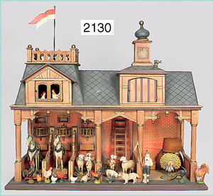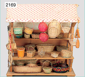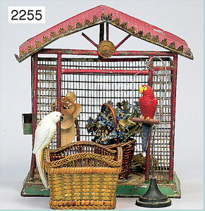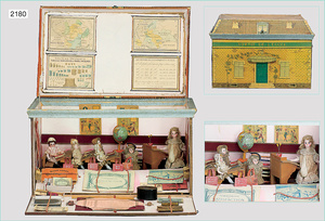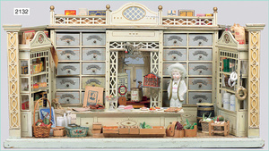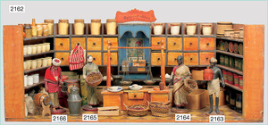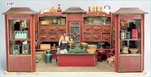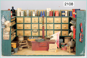HACKER Kaufladen, ca. 1890, 72,5 cm breit, 35,5 cm hoch, 27 cm tief, Schubladen mit lithogr. Papier beklebt (Bouleornamente), Papier an 3 Schubladen fachgerecht ergänzt, Orig.-Tapete am Boden, vorne 2 Schaufenster, mit Theke, Orig.-Bemalung, kl. Stellen farblich ausgebessert, mit Zubehör, (meist alt, ein paar Teile neuer) in einer alten Holzkiste, wohl Orig.