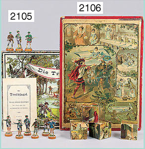 Würfellegespiel, ca. 1880, Deckbild + 4 Bildtafeln, sowie alle Würfel, 29 cm x 24,5 cm, Verzierung am Bildrand nicht kompl.