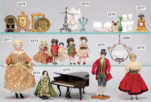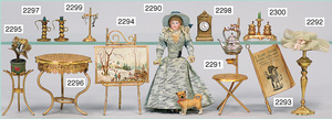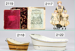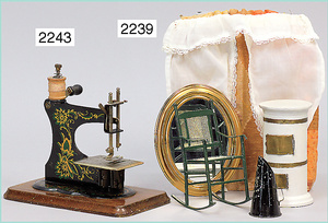 Zeitungshalter, vor 1900, Pappe geprägt, 7,5 cm, mit Orig.-Puppenzeitung und Kalender, für 1894, 1 Bürstenhalter, 1 Bürste fehlt, 8 cm, Stoff, schönes Konv.