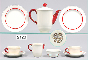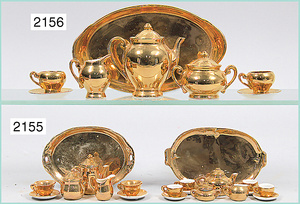 kl. Kaffee-Porzellan-Service, Golddekor, Kanne Höhe 5 cm, 2 Tassen mit Untertasse, Zuckerschale, Milchkanne, Platte, im Orig.-Kart.