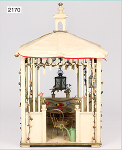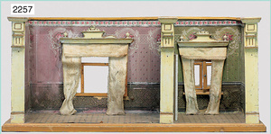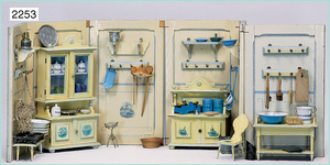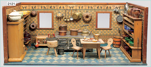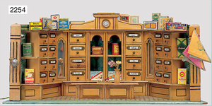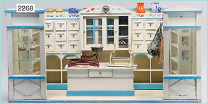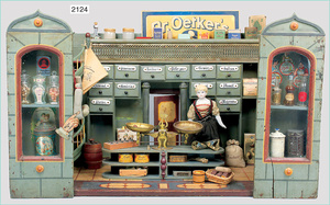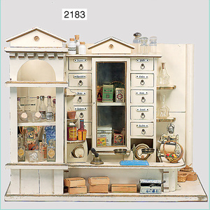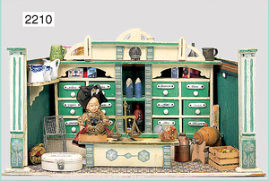 GOTTSCHALK Puppenstube, 71 cm breit, 36 cm hoch, 28 cm tief, verzierte Frontleisten, Schubladen mit Porzellan-Schildern, Orig.-Theke, teilw. farblich überarbeitet, alte Tapete an Wand u. Boden, Zubehör teils alt, teils neuer