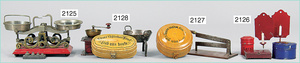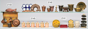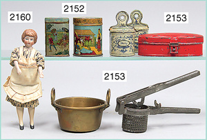 Puppenküchenteile, Reibe, Petroleumkanne, Lampe ohne Glas, 2 Messingschalen, 1 Kuchenplatte, 1 Wandregal für mittelgr. Küche, dazu 1 Rechenmaschine