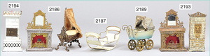 Badezimmergarnitur, bestehend aus frühem Badeofen, teils Messing, teils Blech vernickelt, 18 cm, mit Brenner, dazu 2 Wannen, 2 Badepuppen, 1 kl. Gehäuse Presspappe, 27 cm hoch, 33 cm breit, Spiegelglas hinten gerissen
