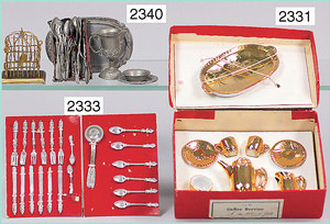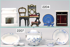 ERZGEBIRGE Speiseservice, 28-teilig, Blumendekor, Suppenschüssel, 4,5 cm Durchm. 1 Henkel fehlt, Suppenteller, Essteller, Vase, Kerzenleuchter, Anbietschale, sehr guter Zust., feines Dekor., selten in diesem Umfang, für herrschaftl. Puppenstube, im Orig.-Kart., Zwischenlagen des Kart. fehlen