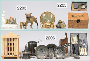 Konv. ca. 25 Teile, Zinn/Glas, u. a. 1 Messingblech vergoldetes Buch, 3 cm, mit eingeklebten Bildern, Zinndose, mit Verschluss, 4 cm, 1 vergoldeter Schirmständer, Zinn, 5 cm, u. a. Fernglas, Glassturz, Servierschale, schönes Konv.