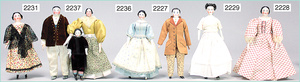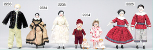 3 Teile Puppenstuben-Puppen, 6 cm - 10 cm, 2 x Ganzbiskuit, 1 x Biskuit-Brustblattkopf, -arme und -beine, Stoffkörper