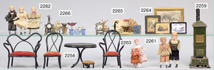Puppenküchen-Herd, ca. 1890, 30 cm breit, 31 cm hoch, Löwentatzenfüße, Messing-Türen mit Griffstange, auflithogr. Kachelmuster, 4 Töpfe, Wasserkessel, Schornstein, Töpfe größenmäßig passend, jedoch nicht alle Orig. zum Herd zugehörig