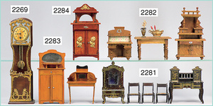 Puppenstuben-Schlafzimmerprogramm, Kleiderschrank, 15,5 cm, Spiegelkommode, 2 Betten, 2 Nachtschränkchen, mit aufgesetzten Jugendstilverzierungen aus Zinn, gold