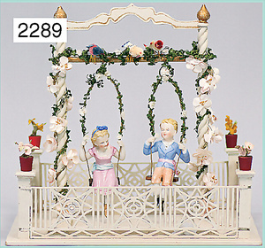 Schaukel, Holz lackiert, Bastelarbeit, dazu 2 schaukelnde Porzellan-Kinder, 13 cm, anmodellierte Kleidung, dekorativ