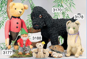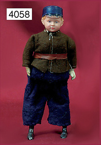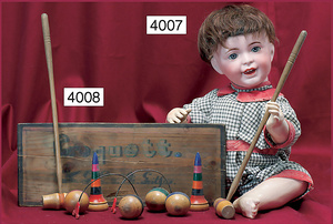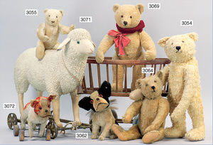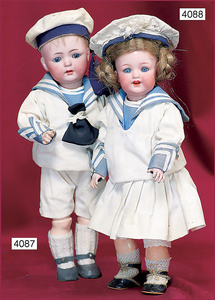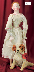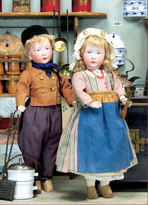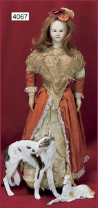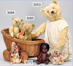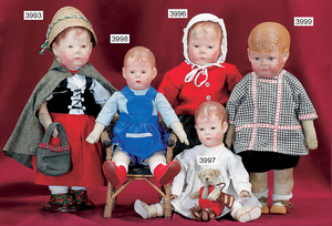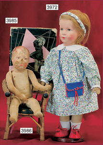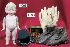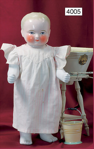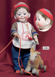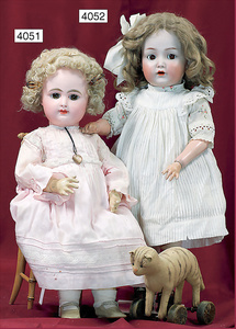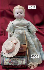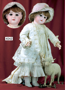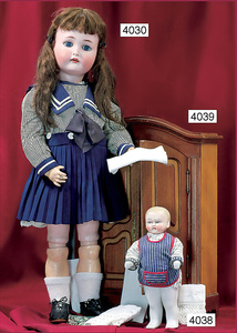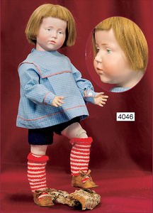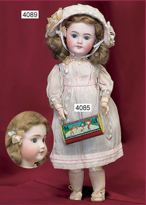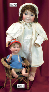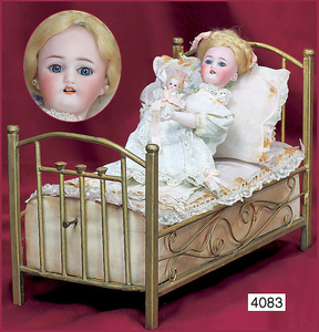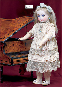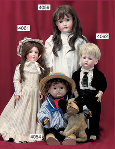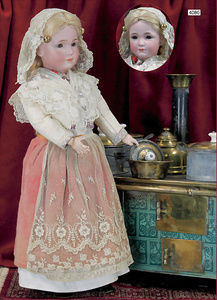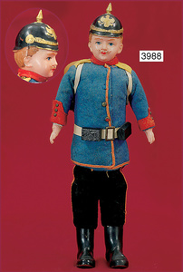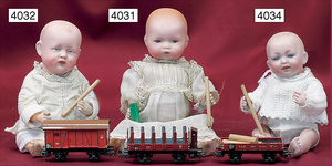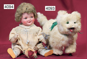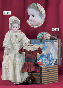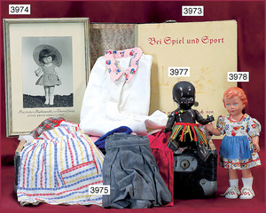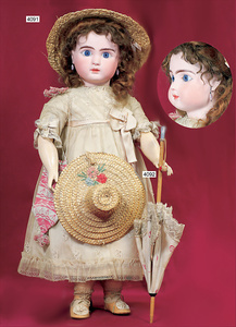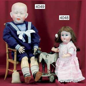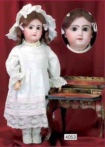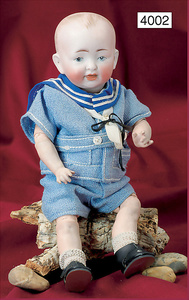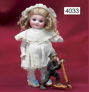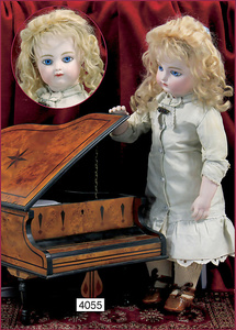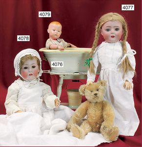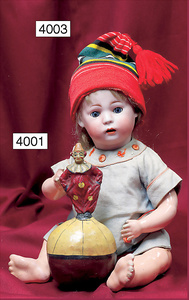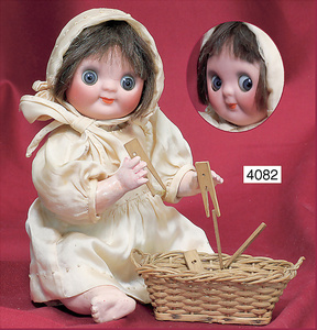 STEINER Baby, Frankreich, gemarkt J Steiner B SGDG Paris FI REA 13, 52 cm, gepresster Biskuit-Kurbelkopf, blaue fest eingesetzte Paperweightaugen, geschl. Mund, Kinngrübchen, durchst. Ohren, alter Federaufzug, Orig.-Mohairperücke in sehr gutem Zust., mit Papiermaché-Kopfdeckel, schöner ausgef. Gliederkörper mit festen Handgelenken und schlanken Fingern, Orig.-Kleidung, -Unterkleidung, -Schuhe und -Strümpfe, unberührter Orig.-Zust., sehr schöner Ausdruck