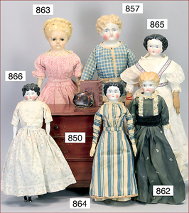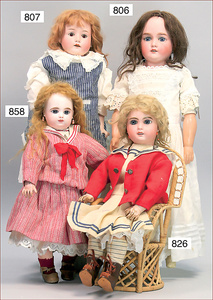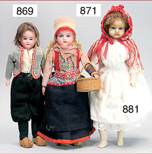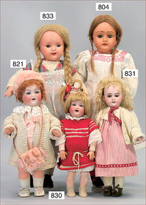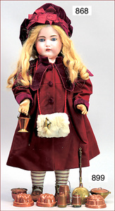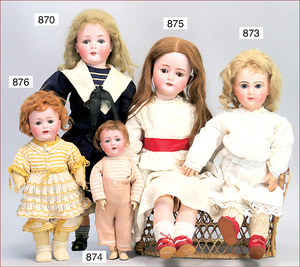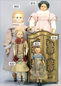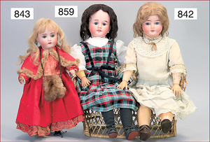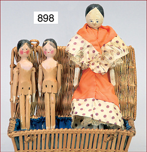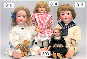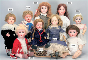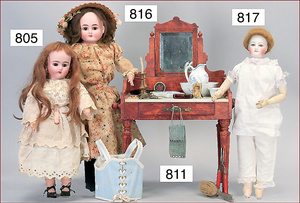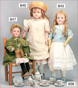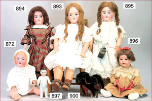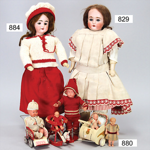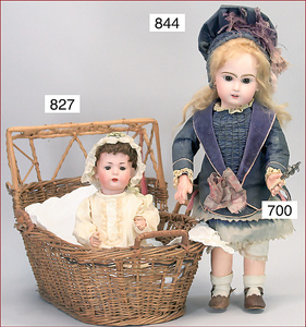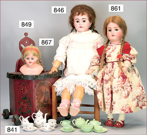 AM Einbindekopf-Baby, Vollkopf, braune Schlafaugen, off. Mund, 2 Zähne unten, Stoffkörper, Stimme defekt, Celluloid-Hände, 28 cm, dazu 1 Puppenkorb, mit einigen Celluloid-Badutensilien, Seifenschale, Zahnbürste, Kamm, Wandhalter, 2 kl. Babyrasseln, u. anderes