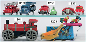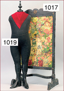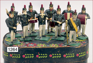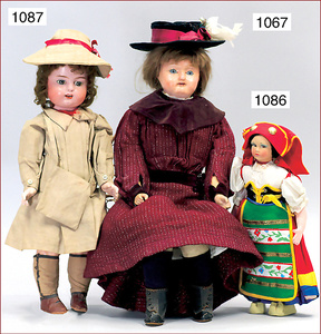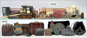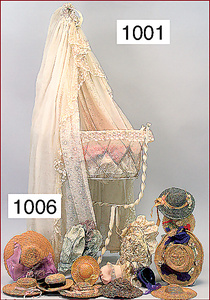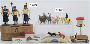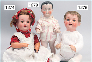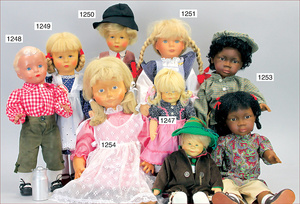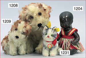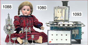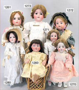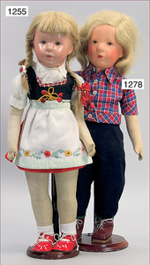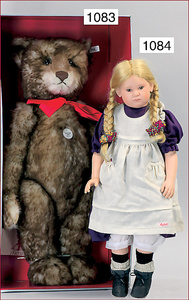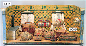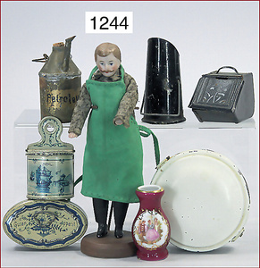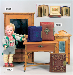 2-tlg. Puppenstube, um 1920, mit Durchgangstür, Fenster unverglast, Länge 1 m, Tiefe 42 cm, Höhe 42 cm, mit reichh. Mobiliar, Wohnzimmer mit Spiegel, Couch mit Hochlehner, Ablage, 1 Tisch, 3 Stühle, kl. runder Tisch, 2 Porzellan-Puppenstuben-Puppen, blond modellierte Frisuren, Stoffkörper, Küche, mit kl. Blechherd, Küchenschrank, Anrichte, Tisch, 2 Stühle, Board, einige Teile Weißblech u. Porzellan