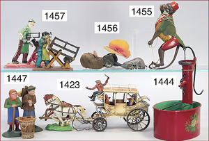 Fundkiste, Kaufladenwaage Blech gemarkt Stella, kl. Holzleiterwagen, 1 Wollschaf, Kinderblechtrommel, 2 kl. Kindertrompeten
