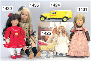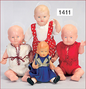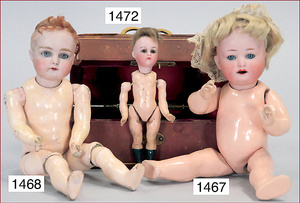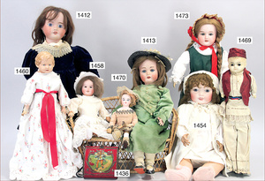 Masse-Puppe, gemarkt 144/12, blaue Schelmenaugen, off. Mund, Zähne, Kunsthaarperücke aufgeklebt, Masse-Stehkörper, bespielt, 3 Finger weggebrochen, 46 cm, dazu Porzellan-Puppe, neu, Brustblatt, Stoffkörper, Porzellan-Arme u. -Unterschenkel, 50 cm, 2 neue Porzellan-Babys, 18 cm