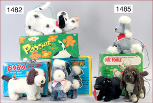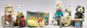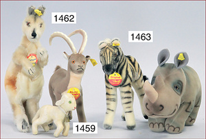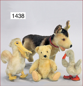 STEIFF Konv. 5 Teile, kl. Biber, Hamster u. Esel, mit Knopf u. Fahne, dazu 1 kl. Eule u. 1 Goldfisch, Knopf u. Fahne fehlen