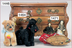 Kl. Masse-Steifbein-Puppe, modellierte Hose, Strümpfe u. Schuhe, seitl. blickend, Farbabrieb an den Armen, 16 cm, dazu 1 Puppenkorb, gefüllt mit Puppenkleidern, meist Handarbeit