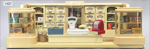 Puppenküchengehäuse, Länge 73 cm, Tiefe 40 cm, Höhe 48 cm, mit umlaufenden Tellerbord, Boden aufgedruckte Kachelmuster