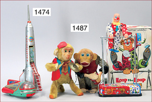 Konv. Mickey Mouse, 1x Vinyl, Walt Disney Produktion, 32 cm, 1x Bank, 22 cm, mit Aufkleber "I´m a bank with a moveable arm", 1x Taschenlampe mit verschied. Lichtern, 1x Boot, 25 cm, Kunststoff, 1x Lernspiel "Poppin Pals"