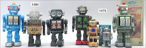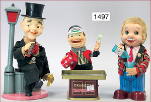Porzellan-Vollkopf-Baby, schwarz gespritztes Porzellan, braune Schlafaugen, off. Mund, Masse-Stehbabykörper, bespielt, 28 cm, dazu 2 kl. Puppenstuben-Puppen, bewegl. Arme u. Beine, 8,5 cm, mit anmodellierten Schuhen u. Strümpfen, ohne Perücke, und 3 kl. Porzellan-Puppenköpfe, 1 x gemarkt 261 Dep, braune fest eingesetzte Glasaugen, geschl. Mund, 1 x gemarkt 3 1/2, braune fest eingesetzte Glasaugen, geschl. Mund, durchst. Ohren, Mohairperücke, mehrere kl. Haarrisse, 2 x Brustblatt, 1 x mit modellierter Frisur, gemarkt 186, 1 x kl. Vollkopf, gemarkt Germany