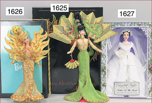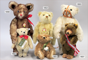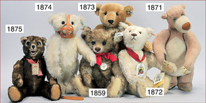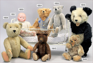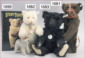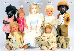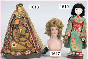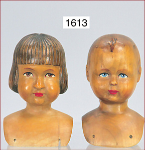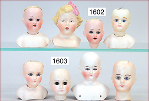 4 Porzellan-Puppenköpfe, 1 x mit Brustblatt, gemarkt 4, blaue fest eingesetzte Glasaugen, geschl. Mund, 1 x Brustblatt mit Kurbelkopf, gemarkt 1, blaue fest eingesetzte Glasaugen, geschl. Mund, durchst. Ohren, 1 x gemarkt 4, blaue fest eingesetzte Glasaugen, geschl. Mund, 1 x gemarkt 3., braune fest eingesetzte Glasaugen, geschl. Mund, durchst. Ohren, kl. Fehler im Porzellan