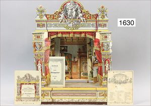 Theater, Ombro-Cinema, transparente Kulisse mit dahinter sich bewegenden Bildern, Kurbelantrieb, Korpus mit lithogr. Papier beklebt, 43 cm breit, 30 cm hoch, Einrissstellen in der Kulisse, ca. 1920