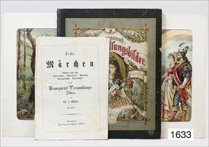 Verwandlungsbilder, zu 6 Märchen von Th. v. Pichler, Verlag Gustav Weise, 2. Auflage, bunt lithogr. Deckblatt, mit Anleitung, "Tischlein deck dich, Dornröschen, Aschenputtel, Däumling, Schneewittchen", die Bilder sind gegen das Licht zu halten, worauf sich die Szene verwandelt, Einband ein wenig verschlissen, insg. unberührter Orig.-Zust.
