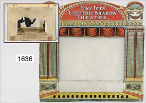 Schattentheater, "tiny tot´s electric shadow theatre", England, mit lithogr. Papier beklebt, 28,5 cm x 28 cm, minim. Einrissstelle am Pergamentpapier, bewegte Scherenschnittmotive, Kerzenfeuerung, bis auf kl. Knickstellen schöner, leicht bespielter Orig.-Zust., ausgef. Gr.
