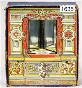 Spiegeltheater, mit sich drehendem Boden, um 1900, 17 cm x 14,5 cm, Pappe mit bunt lithogr. Papier beklebt, schöne Gr.