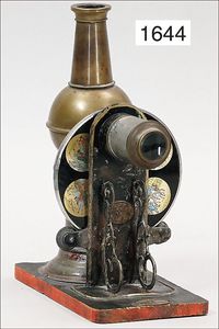 ERNST PLANK Laterna Magica, ca. 1890, mit 9 runden Bildscheiben, bauchige Form, mit Brenner, 24 cm hoch