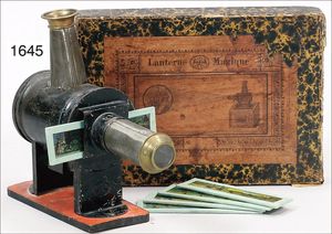 Bilder zu Laterna Magica, Orig.-Kart. gefüllt mit großformatigen ausgef. Glasbildern, 24 cm x 6,2 cm, 24 cm x 8,5 cm, 3 bewegliche Bilder, Leuchter mit Farbenrad, 18 cm x 11 cm, mit Kurbelantrieb, ausgef.