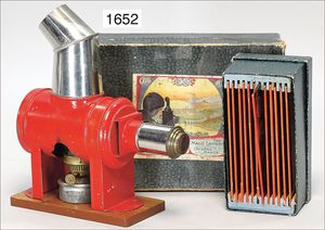 BING Laterna Magica, Blech, auf Holzsockel, 22,5 cm hoch, Orig.-Schornstein, Linse, Brenner, Glas, Glas an Brenner gesprungen, mit Bildsatz, 12-teilig, im Orig.-Kart., Kart. mit bunt lithogr. Deckbild