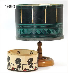 Zootrop, 34 cm hoch, 27,5 cm Durchm. Mit 3 Bildstreifen, teilw. altersbed. seitl. Einrissstellen, museal, ca. 1880