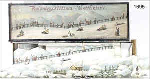 Spiel, Rodelschlitten-Wettfahrt- ein neues mechanisches Gesellschaftsspiel, Pappe mit bunt lithogr. Papier beklebt, 1 Kulissenteil getaped, 2 Blech-Schlitten mit Porzellan-Kindern, ausgefallen