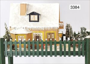 Weihnachtshaus, Pappmache, 63 cm hoch, 44 cm breit, geschmückt mit Tannenbäumen, Kinder auf Ski, ausgefallen