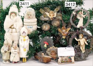 Konv. Christbaumschmuck, Celluloid-Mädchen mit Kreppkleidung, Celluloid-Engel, Kewpie, 1 Trachtenpaar, Masse/Holz, 1 Christbaumstern