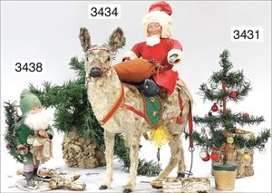 Weihnachtsmann auf Rentier, Weihnachtsmann mit ausdrucksstarkem Biskuit-Gesicht, mit Watte und Kreppkleidung auf Mohair-Rentier, Hörner fehlen, Gesamthöhe 43 cm, 34 cm lang, ausdrucksstark