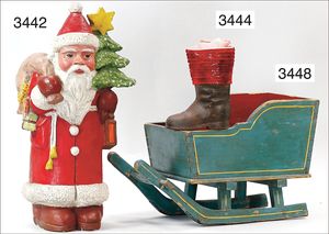3 Teile, 1 x Candycontainer, Pappmache, beflockt, 11 cm, mit Zylinder, 1 x Schneemann, bemalte Watte, mit Zigarre, 1 x Weihnachtsmann, Watte mit Oblaten-Gesicht, Rute und Sack, 11 cm bis 16 cm