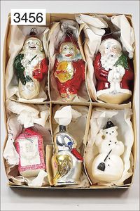 Konv. 6 Teile Christbaumkugeln, teilw. Spiegelglas, teilw. Milchglas, 2 x Clownfigur, 1 x Weihnachtsmann, Schneemann, Ente und kl. Haus, 7 cm bis 10 cm