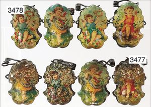 3 Teile, 1 x Schlitten fahrende Kinder, Oblate in Tinselrahmung als Baumanhänger, 1 x Clown, Oblatengesicht auf flach gepresstem Filz, 1 x Engel, Watte/Krepp, mit Oblatengesicht