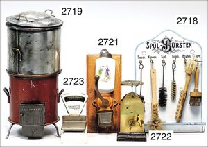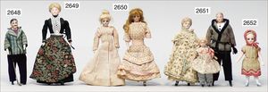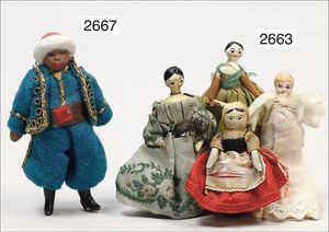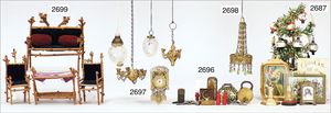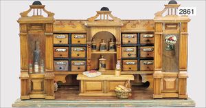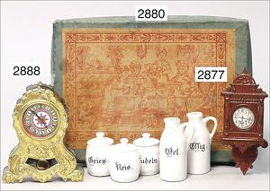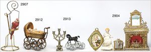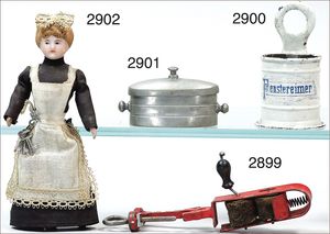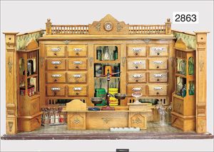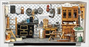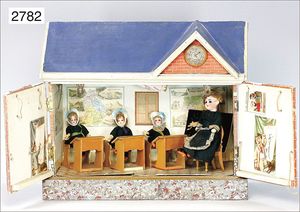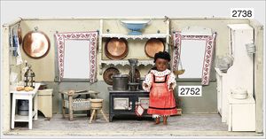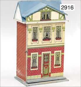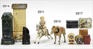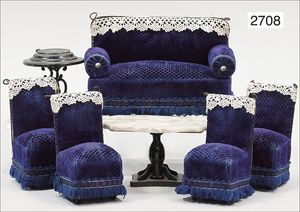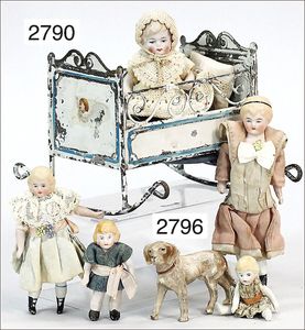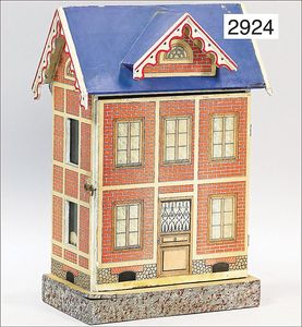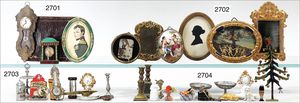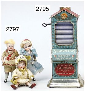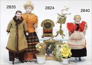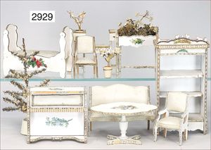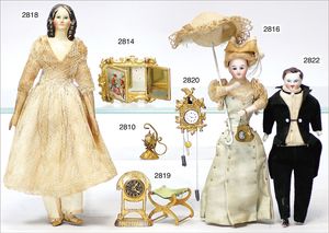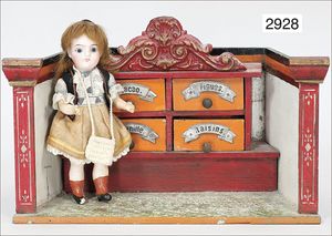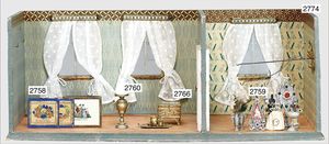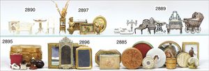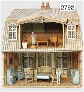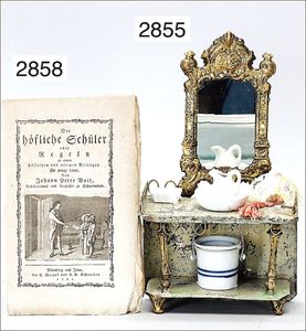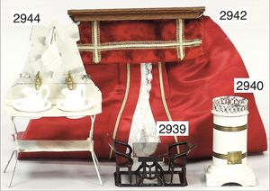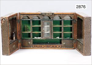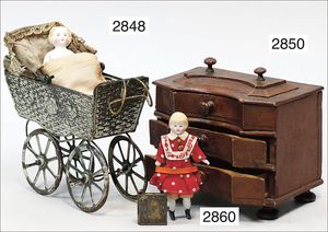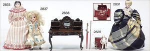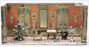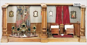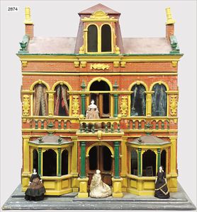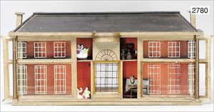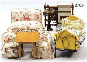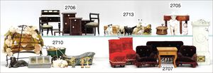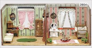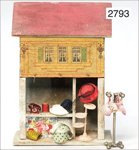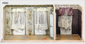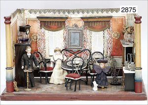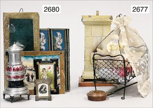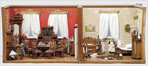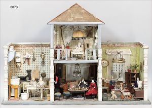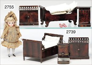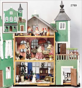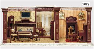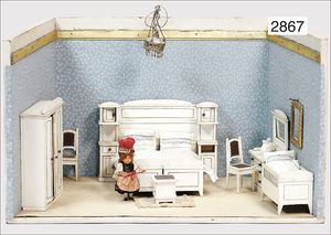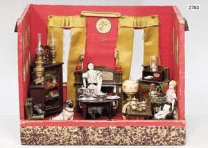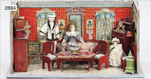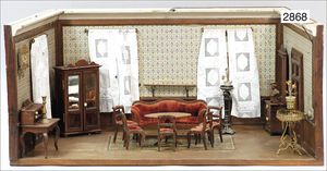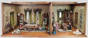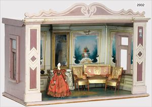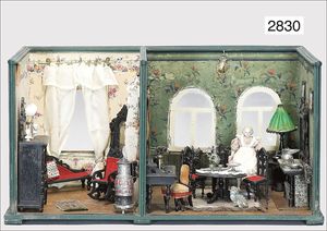 2-teilige Puppenstube, 1,11 m breit, 44 cm hoch, 45,5 cm tief, Orig.-Außenbemalung, alte Tapete an Wand und Boden, 3 Fenster, Vorhang, Verzierungen, Messingblech vergoldet, möbliert, mit herrschaftl. Gründerzeit-Möbeln, Spiegel, Schrank, Kommode mit Aufsatz, Höhe 27,5 cm, Sitzgruppe mit umbautem Sofa, hinten verspiegelt, dazu passend Schlafzimmer, reichh. Zubehörteile, Zinn, Blech, Porzellan, 1 Puppenstuben-Puppe